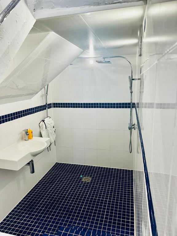 A private staircase (follow the retro EXIT sign) leads downstairs to the former garage and wine store, with its sunken wet room with double shower. Most of the ground floor is given over to a