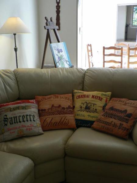The open plan living space sprawls around the former wine cellars. A few discreet reminders of the building's past in the form of the soft scatter cushions evoking the great wines of France - Sancerre, Chablis, Bordeaux, Chanteauneuf du Pape - in the country of Picpoul de Pinet, Noilly Prat and Ricard!