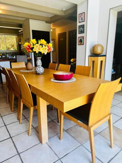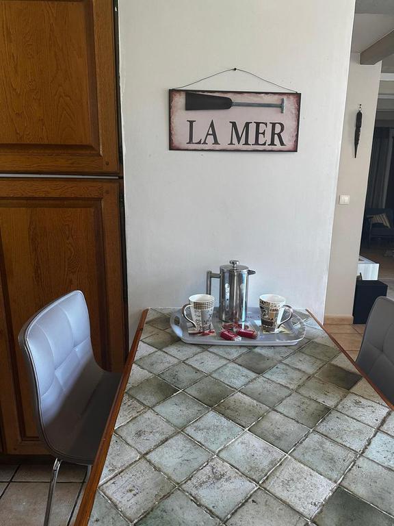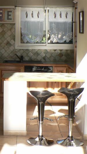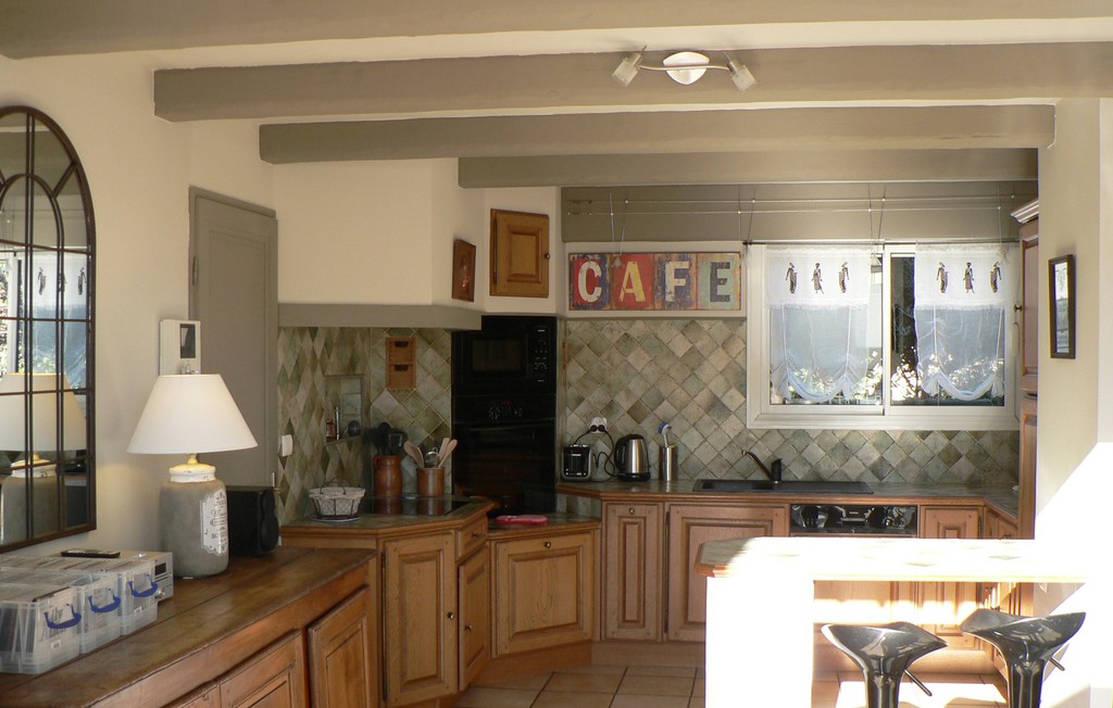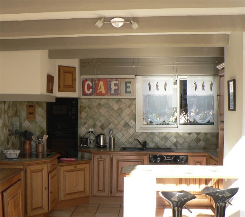 La cuisine donnant sur une salle à manger spacieuse et lumineuse, donnant sur les terrasses autour de la piscine chaussée au jardin des oliviers, orangiers et citronniers.