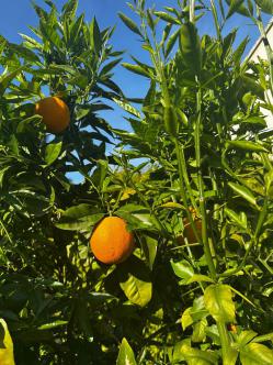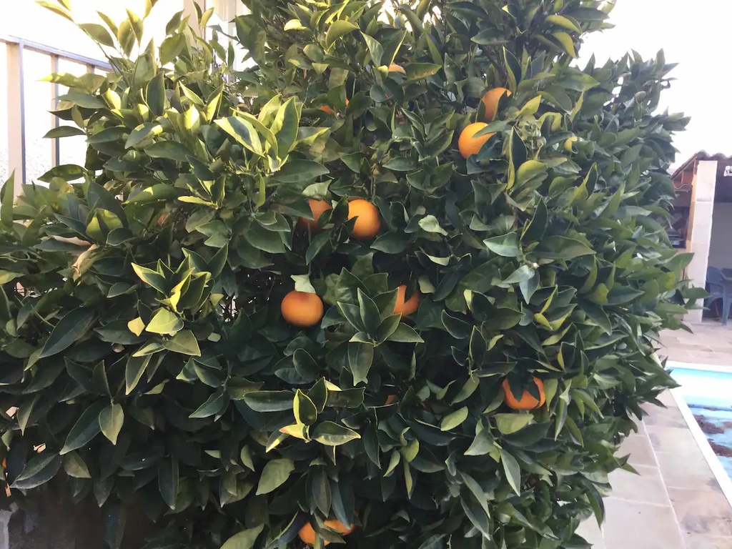 That glass wall opens to a raised terrace above the pool area, where around another family sized table you may enjoy your meal under a shady awning with the scent of the ripening citrus trees beneath the terrace.