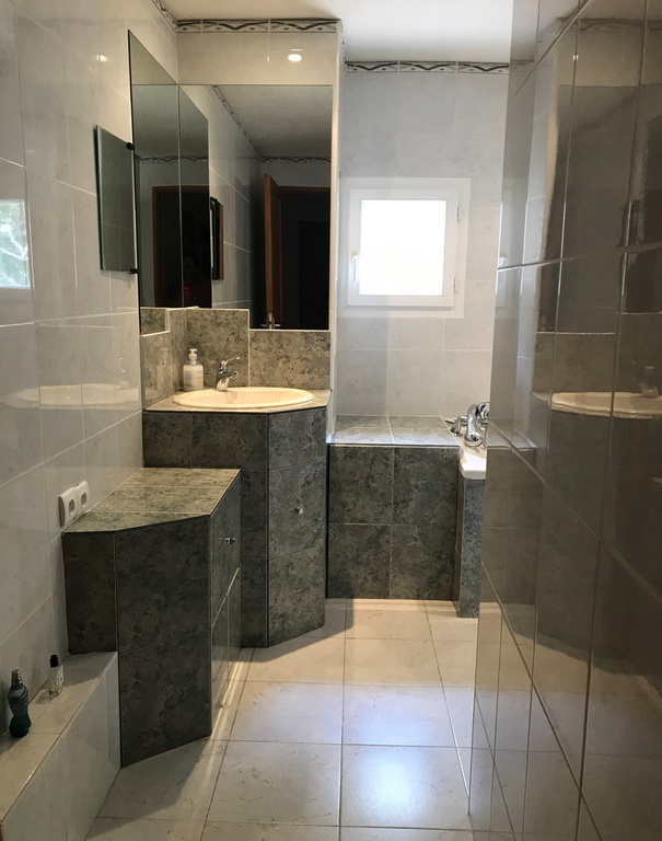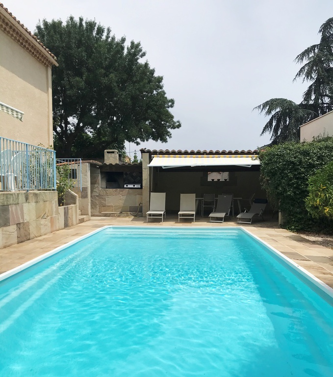 Quatre chambres climatisees (1 au rdc avec sde) et 2 sdb. 3 wc a la maison et 4eme au bord de la piscine.