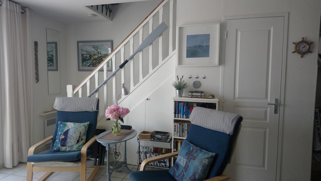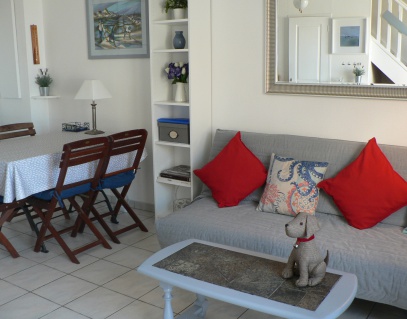 Terrasse et salon-sejour avec coin kitchenette au rdc et deux chambres à l'etage. sde/wc. Wifi. Parking privatif.