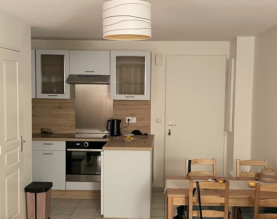 A modern and well- equipped kitchen, which boasts a ceramic hob, microwave and oven for cooking your fresh local fish and veg personally selected from the enticing stalls in Marseillan market.